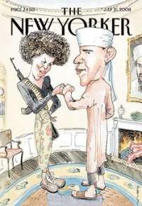 I just picked this up from the from the Concord monitor online. It’s the latest cover of the New Yorker on which “radical positions” appear projected upon a caricature of the Obama’s–presumably in the living room of their posh Hyde Park domicile–asperhaps a parody of their real politics of meaning™? Yes, that’s an American flag burning in the fireplace.